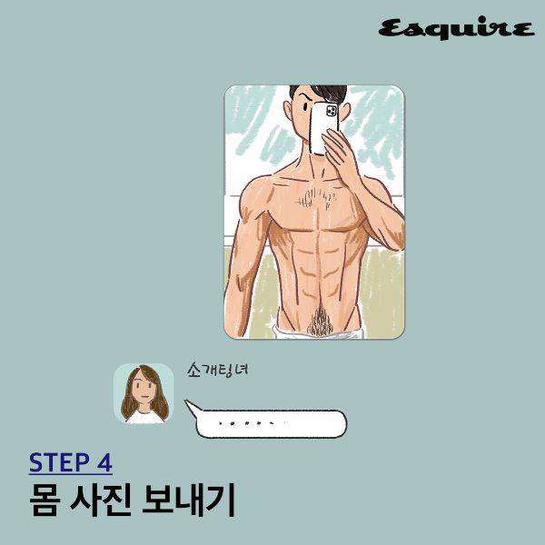 LTE 아니 5G 급으로 구썸남이 되고 싶지 않다면 몸 사진을 보내는 건 자제하자. 헬스로 근육이 빵빵해진 모습 혹은 자신의 샤워하고 난 후 모습이 유난히 멋있긴 해도, 또 그걸 사진으로 남기고 싶더라도, 썸녀에게 보내는 오버를 행하지 말길. 그 사진을 받고 뭐라 대답을 해야 할지 모르겠는 심정을 알아주자. 준비된 남성은 무조건 OK 지만, 섣부른 행동이 관계를 진척시킨다.