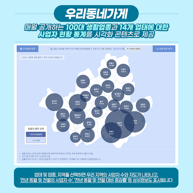 국세통계포털에는 다양한 서비스가 있는데요. 그중에 '우리동네가게'는 매월 공개하는 100대 생활업종과 14개 업태에 대한 사업자 현황 통계를 시각화 콘텐츠로 제공하는 서비스예요. 업태 및 업종, 지역을 선택하면 우리 지역의 사업자 수와 지도가 나타나고, '전년 동월 및 전월의 사업자 수', '전년 동월 및 전월 대비 증감률' 등 상세정보도 표시됩니다.