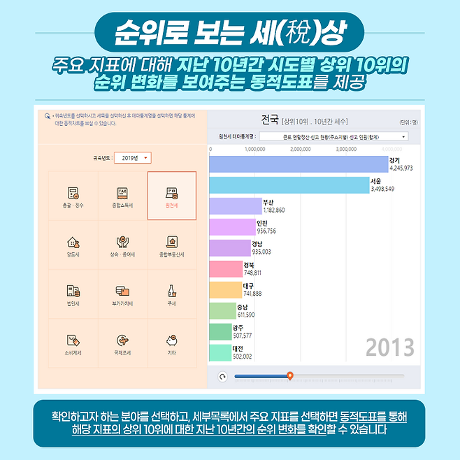 '순위로 보는 세(稅)상'은 주요 지표에 대해 지난 10년간 시도별 상위 10위의 순위 변화를 보여주는 동적도표를 제공하는 서비스입니다. 확인하고자 하는 분야를 선택하고, 세부목록에서 주요 지표를 선택하면 동적도표를 통해 해당 지표의 상위 10위에 대한 지난 10년간의 순위 변화를 확인할 수 있습니다.