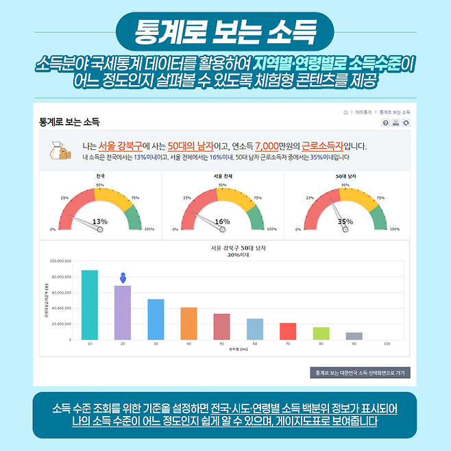 다음으로 '통계로 보는 소득'은 소득분야 국세통계 데이터를 활용하여 지역별·연령별로 소득수준이 어느 정도인지 살펴볼 수 있도록 체험형 콘텐츠를 제공하는 서비스예요. 소득 수준 조회를 위한 기준을 설정하면 전국·시도·연령별 소득 백분위 정보가 표시되어 나의 소득 수준이 어느 정도인지 쉽게 알 수 있으며, 게이지 도표로 보여줍니다.
