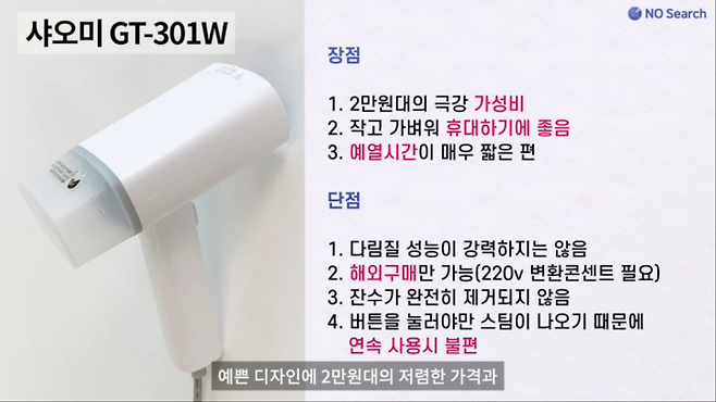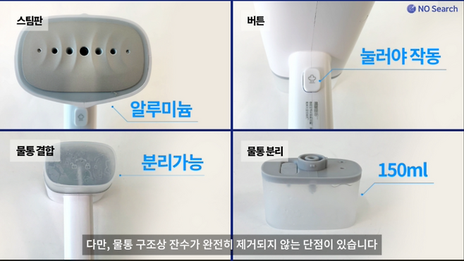 다만, 성능자체가 강력한 편은 아니며, 물통 구조상 잔수가 완전히 제거되지 않는 것과 스팀고정버튼이 없는 것을 단점으로 볼수 있습니다.