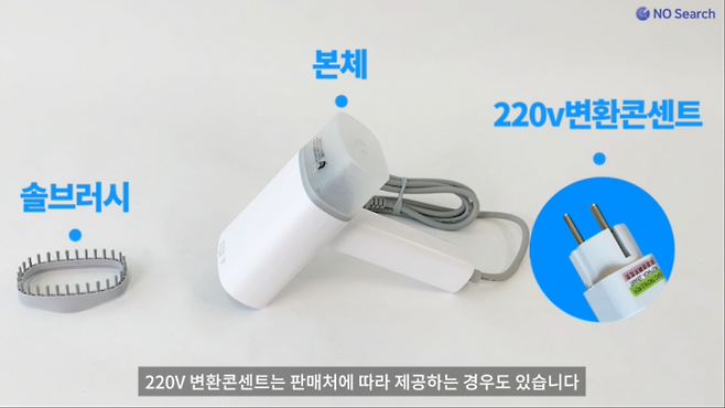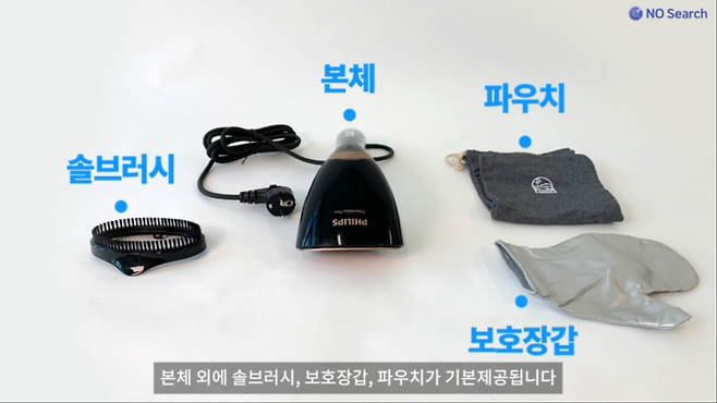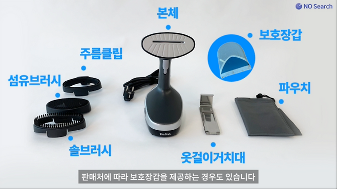 본체 외에 솔브러시, 섬유브러시, 주름클립, 옷걸이거치대, 파우치가 포함되어 있으며, 판매처에 따라 보호장갑을 제공하는 경우도 있습니다.