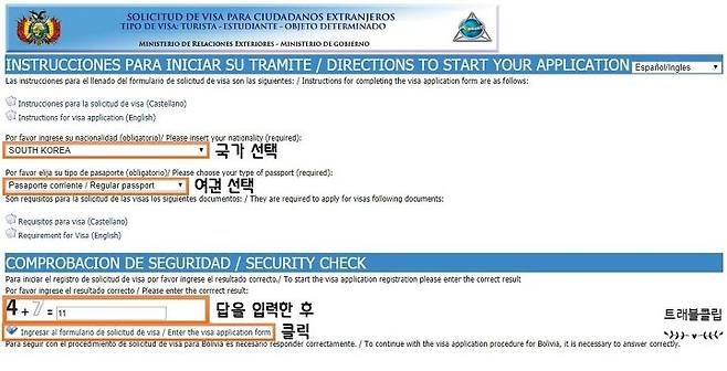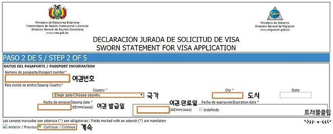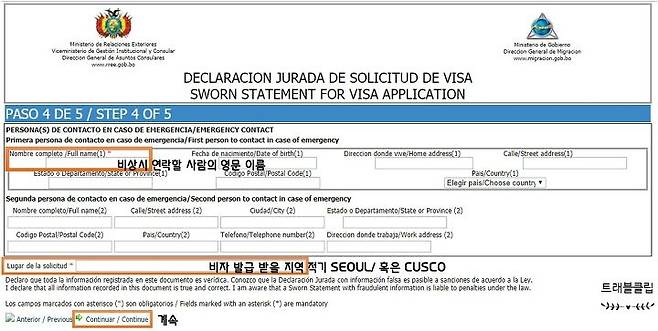 위의 모든 서류가 준비되셨다면 볼리비아 대사관 사이트에 접속하여 비자 발급 온라인 신청을 하면 됩니다.