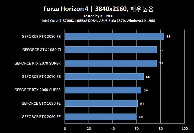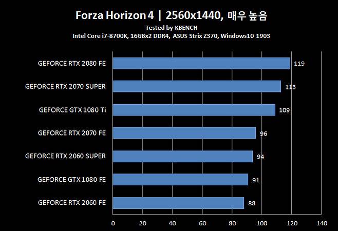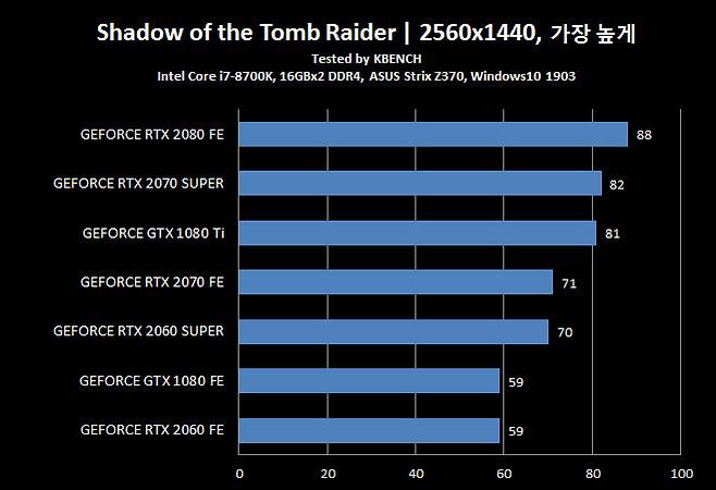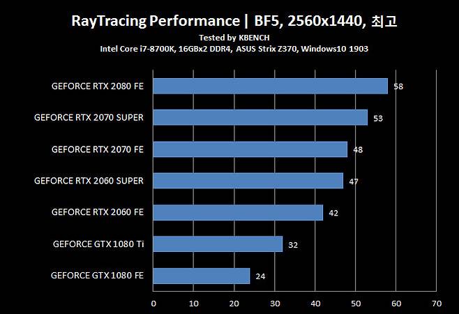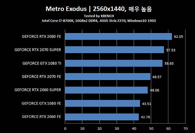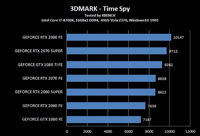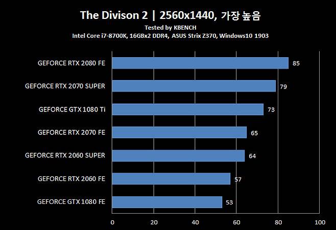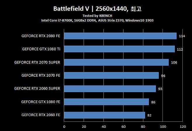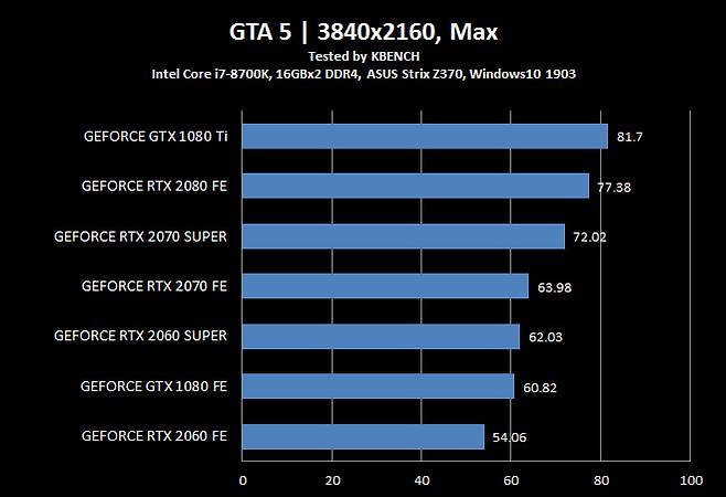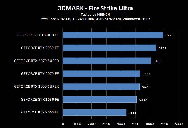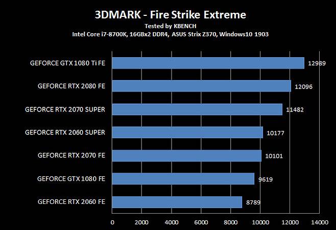 지포스 GTX 1080 Ti 조차 뛰어 넘었다는 지포스 RTX 2070 슈퍼는 모든 항목에서 지포스 RTX 2080과 5~10% 차이를 유지 할 만큼 인상적인 결과를 보여줬다.