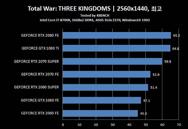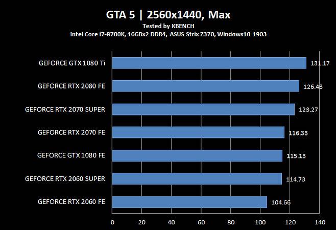 지포스 RTX 2070 슈퍼는 거의 모든 게임에서 지포스 GTX 1080 Ti와 비슷하거나 앞서 결과를 기록했다. 적게는 1~2 Fps, 많게는 6 Fps까지 지포스 RTX 2070 슈퍼가 더 빨랐다. 하지만, 배틀필드V와 토탈워 삼국지 처럼 반대 되는 결과가 나오는 경우도 있어 지포스 GTX 1080 Ti로 성능을 말하기엔 무리가 있어 보였다.