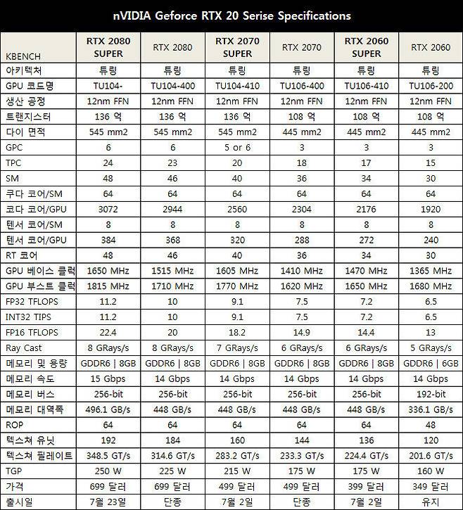구체적으로는 지포스 RTX 2060에서 업그레이드 된 지포스 RTX 2060 슈퍼와 지포스 RTX 2070에서 업그레이드 된 지포스 RTX 2070 슈퍼 모두 256개의 쿠다 코어와 4개의 RT 코어, 32개의 텐서 코어가 추가 됐는데 이 중 지포스 RTX 2060 슈퍼에는 6GB 였던 GDDR6 메모리 용량이 8GB로 증설 됐고 256-bit 메모리 버스도 추가로 적용되면서 336.1 GB/s 였던 메모리 대역폭이 448 GB/s로 33%나 증가됐다.