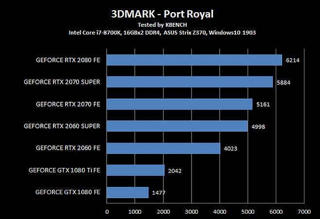 지포스 RTX 2060 슈퍼는 지포스 RTX 2070에 매우 근접한 성능을 실현 했고 모든 항목에서 지포스 GTX 1080 보다 높은 점수를 기록했다. RT 코어 성능에 좌우되는 포트 로얄만 성능 차이가 조금 컸는데 저 정도면 실제 게임에선 무시해도 될 수준이다.