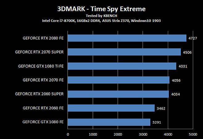 지포스 GTX 1080 Ti 조차 뛰어 넘었다는 지포스 RTX 2070 슈퍼는 모든 항목에서 지포스 RTX 2080과 5~10% 차이를 유지 할 만큼 인상적인 결과를 보여줬다.