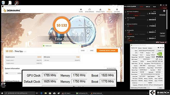 지포스 GTX 2070 슈퍼는 OC Scanner를 돌린 결과 보다 수동으로 조절한 결과가 더 좋았다. 부스트 클럭에 150MHz를 추가해 9713점 였던 3DMARK 타임 스파이 점수를 10132점으로 상승 시켰다.
