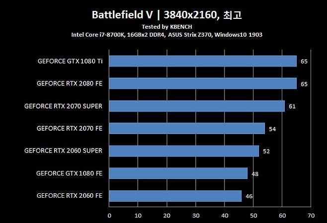 지포스 RTX 2070 슈퍼는 거의 모든 게임에서 지포스 GTX 1080 Ti와 비슷하거나 앞서 결과를 기록했다. 적게는 1~2 Fps, 많게는 6 Fps까지 지포스 RTX 2070 슈퍼가 더 빨랐다. 하지만, 배틀필드V와 토탈워 삼국지 처럼 반대 되는 결과가 나오는 경우도 있어 지포스 GTX 1080 Ti로 성능을 말하기엔 무리가 있어 보였다.
