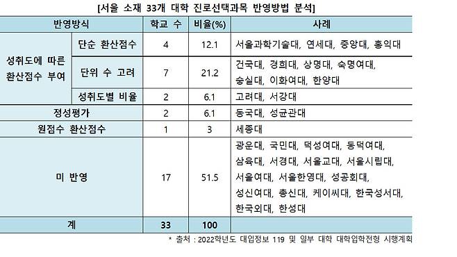 이 가운데 건국대 등 7개 대학은 이수 단위까지 고려해 성적을 산출한다. 대체로 성취도 A에 1등급을 부여해 학생들의 평균 등급 상승을 유도한다. 또 숙명여대는 성취도 B에도 2등급이라는 높은 등급을 부여하므로 진로선택과목에 따른 학생들 간 변별력은 매우 낮을 것으로 보인다.
