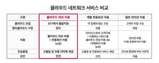 SKT 클라우드 허브는 이용 기업이 자사 서버를 CSP 클라우드 별로 일일이 개별 접속할 필요 없이 한 번만 연결하면 되는 전용회선을 통해 즉시 이용 가능하다. 클라우드 전환을 위해 직접 네트워크 장비를 구축해야 하는 번거로움을 해소하는 것은 물론 최소 8주 정도의 구축 시간도 아낄 수 있다. 해당 기업이 개별적으로 전용회선을 구축해 운영할 때와 비교하면 약 80% 수준의 비용절감이 가능한 것으로 추산된다.