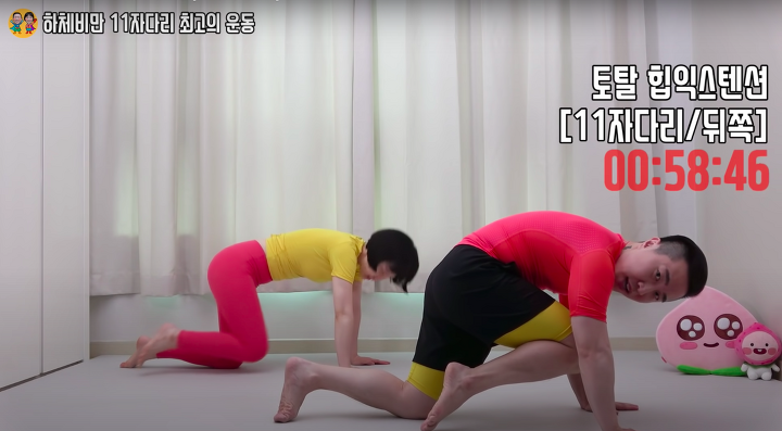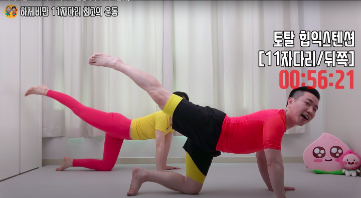 집에서도 쉽게 따라할 수 있는 홈트 동작을 소개하는 것으로 유명한 땅끄부부가 알려주는 '토탈힙 익스텐션' 동작. 엎드린 상태에서 등을 복부에 힘을 준 채 둥글게 말았다 다리를 쭉 편다. 이런 식으로 몸을 말았다 폈다를 수회 반복한다. 엉덩이와 뒤쪽 허벅지 라인에 자극이 오는 동작. 중간 중간 펄스 동작으로 다리를 뻗은 채 다리만 까딱까딱하는 느낌으로 위 아래로 움직인다.