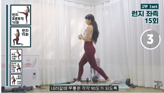 하체운동 일명 '하체토닝' 영상으로 알려진 제이제이살롱드핏이 알려주는 모든 하체를 쓰는 런지 동작. 뒤쪽 허벅지 전면부를 버틴다는 느낌으로 위 아래로 업다운 하는 런지 동작을 반복한다. 아래로 내려갈 때 무릎이 각각 90도가 되도록 하고 복부에 힘을 줘서 허리가 꺾이지 않도록 유의한다. 이 때 뒤쪽 다리에 모든 체중을 실어 준다는 느낌으로 업다운을 반복하는데 올라오면서 엉덩이가 수축되는 기분도 느껴본다. 다운된 상태에서 뒷다리를 뒤로 올렸다가 앞으로 차주는 런지프론트킥도 함께한다.