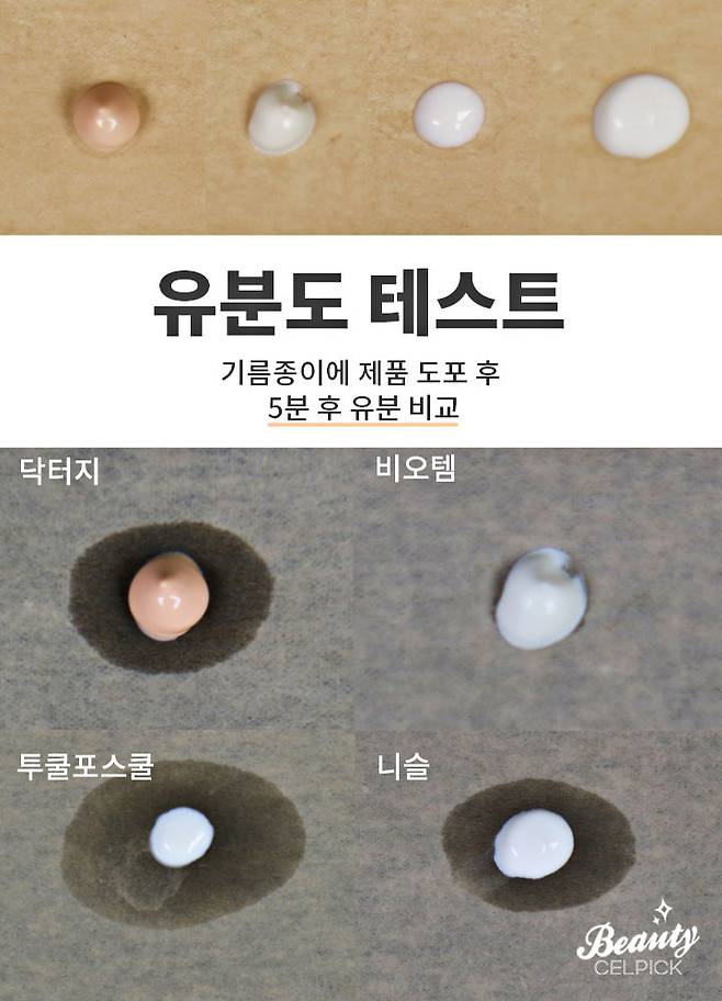 니슬 제품은 발림성 우수! 유분감도 가장 적당한 수준으로 측정됐어요. 닥터지 제품은 보송한 마무리감에 비해 유분이 꽤 들어있습니다. 투쿨포스쿨은 기름종이에 도포하자마자 기름이 퍼지기 시작했어요. 프라이머 기능이 함유돼 유분 함량이 많다는 것 참고해주세요!