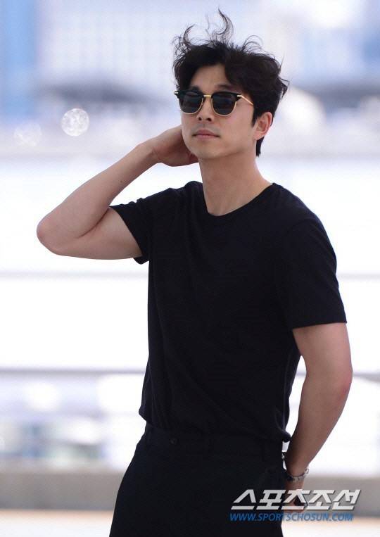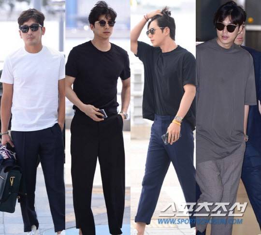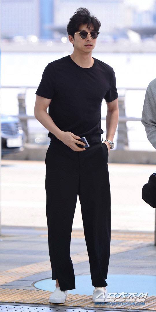 공유의 자유분방한 매력이 제대로 드러난 올블랙 스타일. 영화 '부산행' 관련 프로모션 차 칸으로 출국했던 날의 그는 탄탄한 상체라인을 돋보이게 하는 블랙 컬러의 반팔 티셔츠에 오버사이즈의 블랙 팬츠를 매치했다. 편안하면서도 남성미가 물씬 느껴지는 스타일이다. 답답한 구두는 노노! 화이트 컬러의 슬립온을 더해 화사한 계절감을 살렸다. 메탈릭한 손목시계와 골드 프레임의 선글라스는 시크함을 더한다.