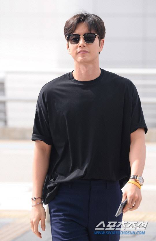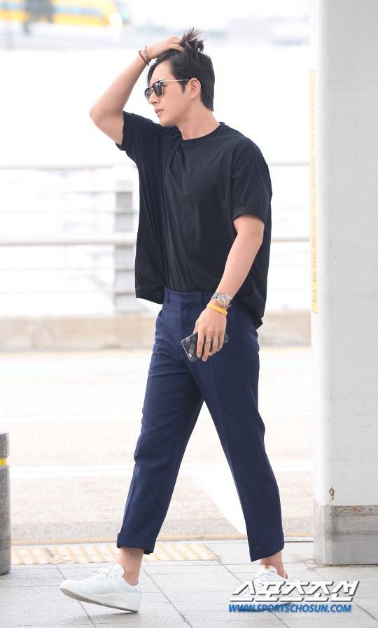 대만 팬미팅 행사 출국 차 공항에 나섰던 박해진. 그는 어깨 깡패 면모가 제대로 돋보이게 하는 밀착 블랙 티셔츠에 짙은 네이비 컬러의 슬랙스 팬츠를 매치해 편안하지만 컬러감각이 제대로 살아있는 스타일을 온성했다. 아이템 자체는 심플하지만 팬츠 안으로 티셔츠를 넣는 정도와 팬츠 롤업의 정도를 조절해 디테일을 살린 패션 센스가 돋보인다. 박해진의 사진에서 늘 포착할 수 있는 옐로우 팔찌는 이날 역시 빠지지 않았다.