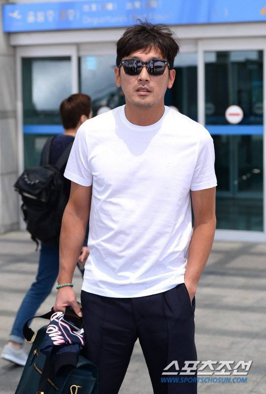 영화 '아가씨'의 해외 프로모션 차 출국할 당시의 하정우. 타이트한 핏의 흰 티셔츠에 짙은 네이비 컬러의 슬랙스를 매치한 편안한 스타일을 선보였다. 여기에 블랙 프레임 선글라스를 살짝 얹고 고급스런 레더 소재 빅백을 손에 가볍게 쥐어 밋밋할 수 있는 룩에 고급스러운 포인트를 줬다. 티셔츠와 같은 컬러의 화이트 스니커즈가 여유로움을 더한다.