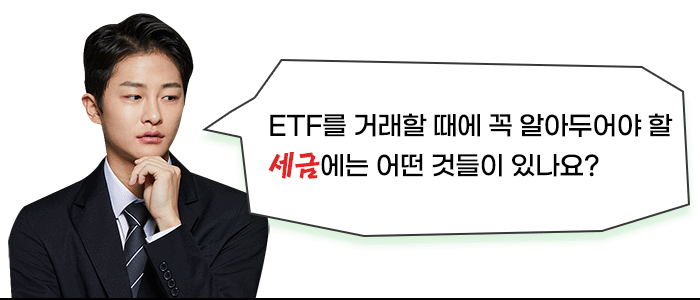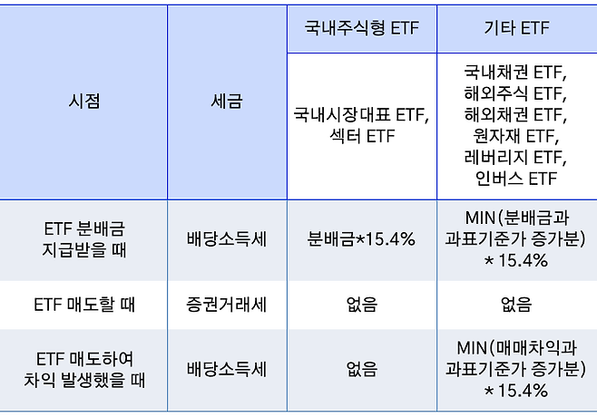 ETF를 팔아 매매차익을 거두었을 때, 그 양도차익에 대해서는 배당소득세 또는 양도소득세를 과세(단, 국내주식형 ETF는 비과세)합니다.