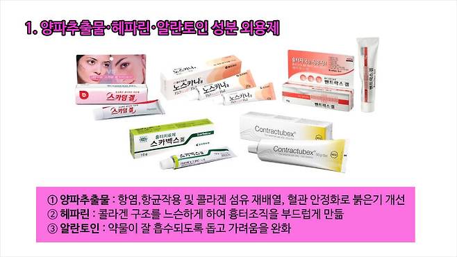 그래서 이 연고들에 들어있는 성분들이 콜라겐 섬유의 구조를 느슨하게 하고 새살 조직의 과다증식을 억제합니다. 염증을 가라앉히고 혈관을 안정시키는 작용도 하죠.