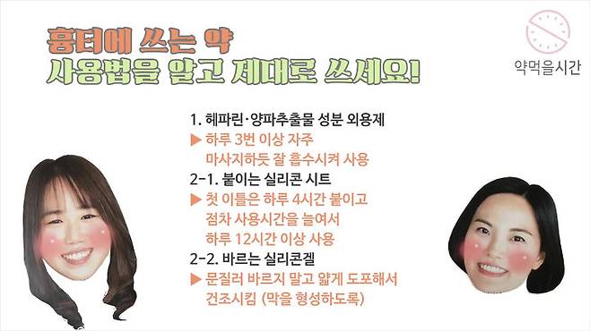 붙이는 시트 타입은 우선 크기에 맞게 잘라서 사용하구요. 처음 이틀 동안은 4시간씩 붙이고 그 다음 사용시간을 점차적으로 늘려서 피부가 적응할 수 있게 해야 합니다.