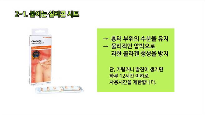 새살이 돋고 아문 부위가 건조하게 되면 흉터가 더 잘 생길 수 있어요. 그래서 실리콘을 덮어 그 부위에 수분을 유지시켜주고 흉터부위 압박으로 조직이 올라오는 것을 막게 되면 콜라겐의 과한 생성을 막아 흉터를 완화시켜 줍니다.