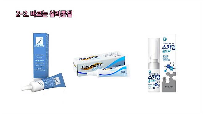 하나는 양파추출물, 헤파린 성분 등으로 이루어진 연고와 다른 하나는 실리콘 성분의 제품이죠.