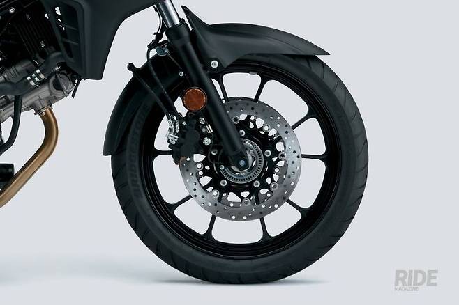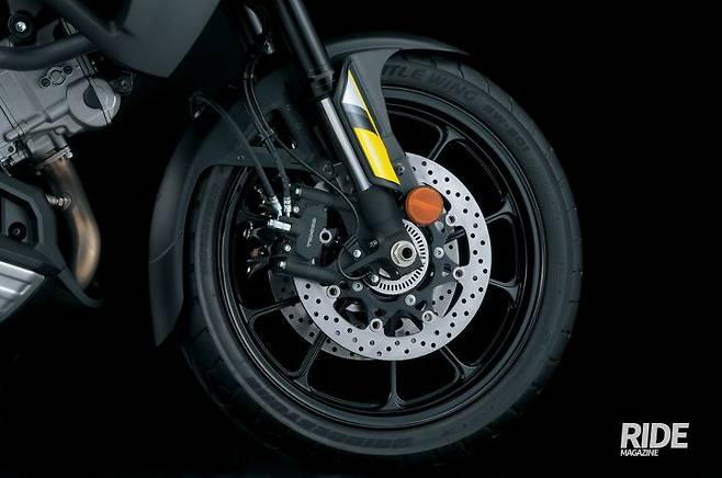 브이스트롬 650 휠은 새롭게 설계된 10스포크 캐스트 휠을 적용했다. 새로운 휠로 인해 전/후 휠 무게가 100g 가벼워졌고, 브이스트롬 1000과 같아져 완벽한 패밀리 룩을 완성시켰다. 와이어 스포크 휠을 사용하는 650XT도 림에 챔피언 옐로우 색상을 적용해 유니크한 분위기를 연출했다. 타이어 세트는 기존과 동일한 프론트 110/80-19인치, 리어 150/70-17인치다.