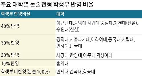 학생부 반영 비율은 꾸준히 감소하는 추세이며 논술 100%로 선발하는 대학이 늘어나고 있다. 또 명목상 내신반영 비율이 40%인 경우에도 내신 실질반영률이 오히려 더 낮은 대학도 있다. 학생부 실질 반영률 자체도 매우 미미하므로 내신 4~5등급대의 학생이라면 내신을 크게 신경 쓰지 않아도 된다. 심지어 그 이하의 내신 등급대 학생이라도 대학에 따라서 내신의 영향을 거의 받지 않고 논술 실력에 의해 합격이 결정될 수도 있다. 수리논술을 준비하는 학생이라면 내신에 대한 부담을 갖지 말고 오직 수리논술 실력 향상에만 집중하면 된다.