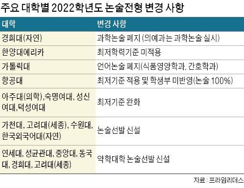 가톨릭대 자연과학 계열의 소비자주거학과, 의류학과, 아동학과는 2022학년도 논술전형에서 언어논술만 실시하며 식품영양학과와 간호학과는 기존의 언어논술+수리논술에서 수리논술만 출제하는 것으로 변경되었다. 또 경희대(자연)가 기존의 과학논술을 폐지했다. 2022학년도에 과학논술을 실시하는 대학은 연세대, 연세대미래(의예), 성균관대, 중앙대, 건국대, 경희대(의예), 아주대(의학) 등이다.