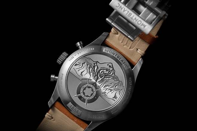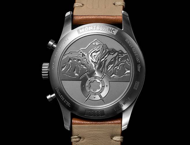 1858 컬렉션의 다른 셀리타 베이스 시계들과 마찬가지로 무브먼트는 의도적으로 노출하지 않고 있습니다. 대신 케이스 소재에 따라 스틸 혹은 브론즈 코팅 마감한 티타늄 케이스백 중앙에 몽블랑 산 형상을 배경으로 2개의 등산용 아이스 피크(얼음 곡괭이)가 나침반과 몽블랑 스타 로고와 함께 어우러진 스페셜 인그레이빙을 추가했습니다. 케이스백만 봐도 한눈에 1858 컬렉션을 관통하는 ‘산악 탐험 정신’의 테마를 이해할 수 있을 정도입니다. 케이스백 테두리에는 100m 방수 사양 및 몽블랑 자체적으로 500시간에 걸쳐 진행되는 몽블랑 랩 테스트 500(Montblanc Laboratory Test 500)를 통과한 제품임을 알 수 있는 인그레이빙도 확인할 수 있습니다.