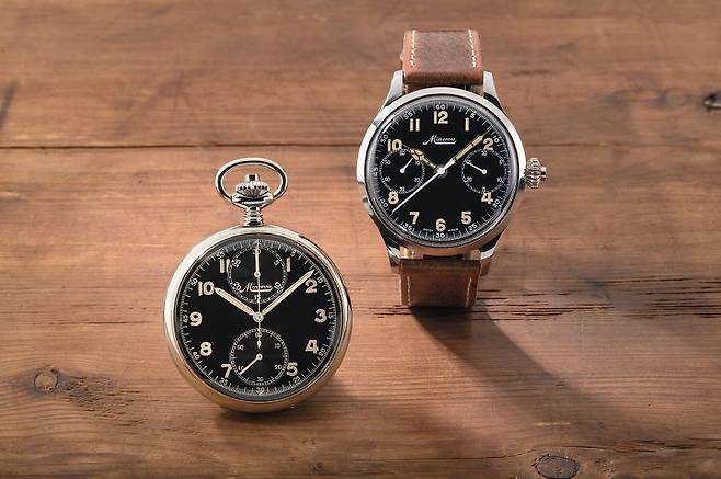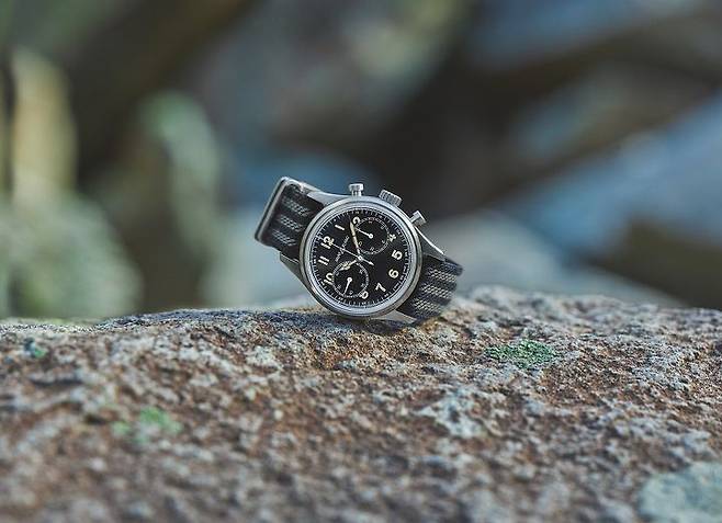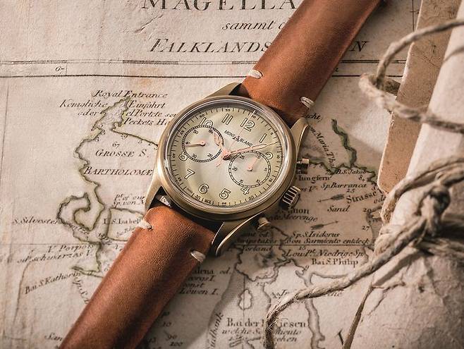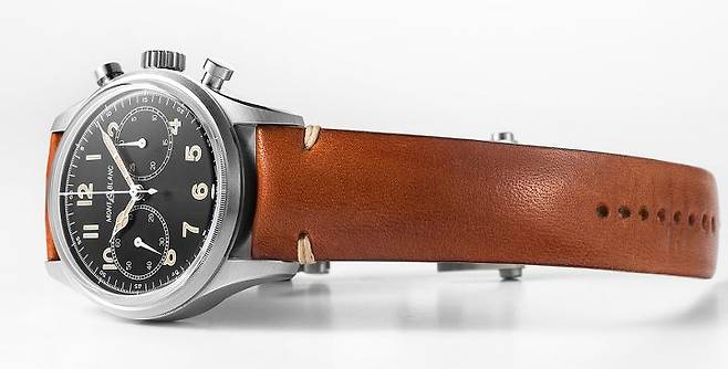 더불어 다이얼의 투 카운터 배열도 주목할 필요가 있는데, 이는 1858 컬렉션에 직접적인 영향을 준 미네르바의 1920~30년대 크로노그래프 손목시계에서도 확인할 수 있는 일종의 시그니처로, 3시 방향에 분 카운터를, 9시 방향에 초 카운터(스몰 세컨드)를 배열한 것부터가 역사적인 크로노그래프 칼리버 19-09를 탑재한 미네르바의 첫 크로노그래프 손목시계의 그것과 일치합니다. 투 카운터 혹은 바이-컴팩스(Bi-Compax), 국내 시계애호가들 사이에서는 일명 ‘부엉이’라는 별명으로도 통하는 해당 크로노그래프 레이아웃은 1858 컬렉션의 원형이 되는 요소이기도 하거니와 빈티지 크로노그래프 시계 디자인을 재현할 때 가장 안전한 선택 중 하나입니다. 또한 앞서 전개한 모노푸셔 방식의 수동 크로노그래프 라인업을 통해 이미 충분히 접한 형태이기 때문에 컬렉션상의 연계성도 있고, 자연스러운 라인업 확장이라는 인상을 줄 수도 있습니다.