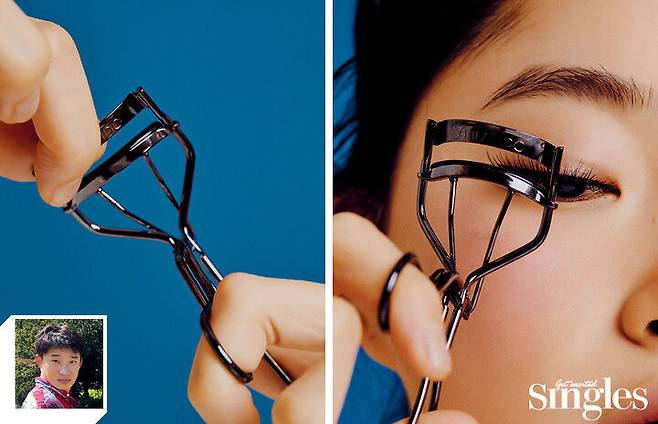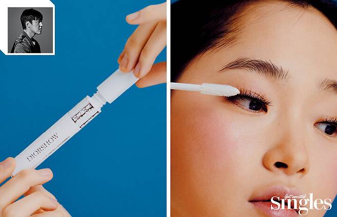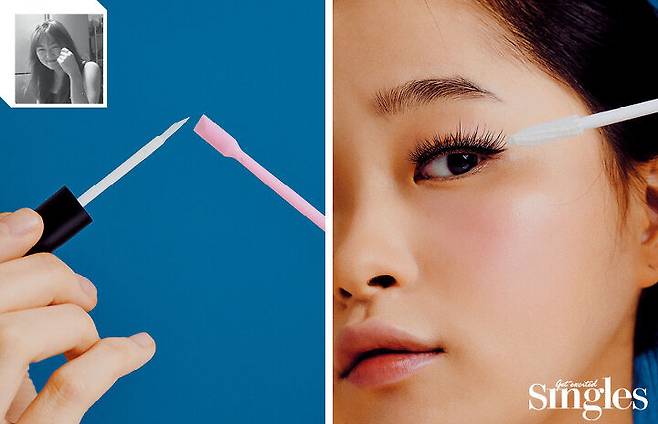 2 뷰러로 속눈썹 뿌리부터 꼼꼼하게 터치해서 컬을 잡는다. 애플리케이터가 아주 얇은 마스카라를 뿌리 쪽 위주로 지그재그로 바르는 것이 핵심.