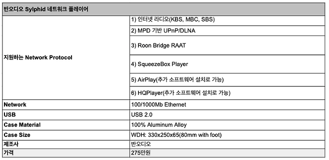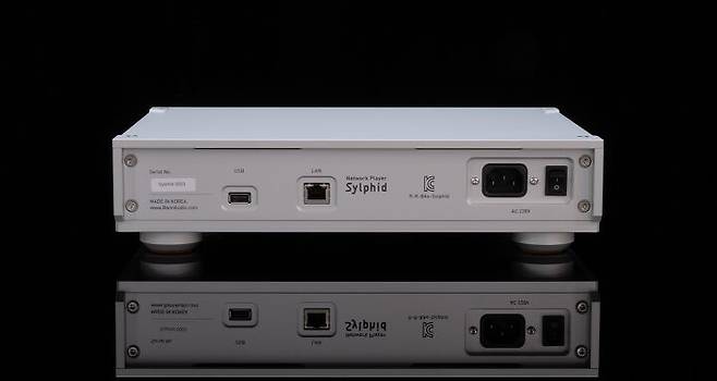 R2R 방식의 DAC인 파이어버드(FireBird) 시리즈로 호평을 받았던 반오디오에서 출시한 네트워크 플레이어 실피드(Sylphid)는 오직 음질만을 위해 꼭 필요한 기능만을 탑재한 심플한 기기이다. W 330 x D 250 x H 65mm의 크기에 케이스 전체를 5~20T에 이르는 두께의 알루미늄 합금으로 제작했는데 전면은 20T, 윗면은 6T, 측면은 5T, 바닥은 8T 두께의 알루미늄을 사용했으며 커넥터가 있는 후면과 바닥의 받침까지도 역시 통 알루미늄을 CNC로 가공하여 사용하였다. 크기에 비해 무게도 꽤 나가고 내외부의 진동을 억제하는 효과도 클 것으로 기대된다. 뒷면의 연결 단자는 전원 단자를 제외하면 오로지 기가비트 급의 랜 단자와 DAC 연결을 위한 USB 2.0 단자뿐이다. 본체에서 조작 스위치라고는 전원 단자 옆의 전원 스위치가 유일하다. 실피드에 없는 것부터 말하면 내장 DAC도 없고 자체 디스플레이나 화면 출력도 없으며 와이파이도 지원하지 않고 자체 앱도 없고 음원을 저장할 내부 저장장치도 없다. 사용자로서는 불편한 기기라고 할 수도 있으나 바꿔 말하면 그만큼 오직 음질에 충실한 기기이다.