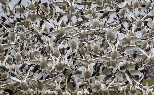 [리치먼드=AP/뉴시스]10일(현지시간) 캐나다 브리티시 컬럼비아주(BC) 리치먼드에 있는 게리 포인트 공원에서 흰거위 떼가 날고 있다. 시베리아에서 번식하는 흰거위는 BC 남부, 미 워싱턴주, 캘리포니아주 북부의 강어귀에서 먹이를 먹으며 겨울을 난다. BC 환경부는 매년 겨울 10만 여 마리의 새가 프레이저강 삼각주에 이주해 서식하는 것으로 추정하고 있다. 2021.01.11.