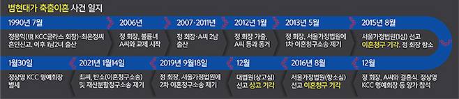 범현대가(家)인 정몽익(59) KCC글라스 회장이 중혼(重婚) 상태인 내연녀에게 수백억원대 자산을 건넨 것으로 확인됐다. 정 회장은 아내 최은정(58)씨와 두번째 이혼 소송 중이다. 정 회장이 내연녀와의 사이에 자식을 두고 이혼을 원치 않는 부인을 상대로 지속적으로 이혼소송을 제기하는 것과 관련, 현행 가족법이 혼인 파탄의 책임이 없는 배우자 보호에 미흡하다는 지적이 나온다.