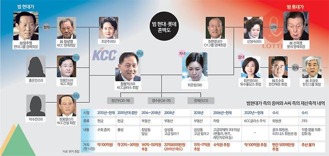 21일 세계일보 취재를 종합하면 정 회장은 2015년부터 최근까지 내연녀 A씨에게 수십억원씩 수차례에 걸쳐 현금 100억원 이상을 증여한 것으로 알려졌다. 정 회장의 모친인 조은주 여사도 2000년대 중반 A씨에게 현금 20억∼30억원 규모를 건넨 것으로 전해졌다. 이런 증여 사실은 정 회장 부부의 1100억원대 이혼소송 등에서 언급된 적이 없는 내역이다.