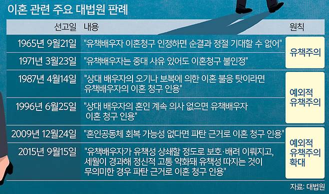 대법원은 이혼 사건에서 혼인 파탄에 책임이 있는 배우자의 이혼 청구를 받아들이지 않고 있다. 이른바 ‘유책주의’를 고수하고 있는 것이다. 그렇지만 시대가 변하면서 사실상 혼인관계가 파탄 상태에 이르렀다면 이혼을 허용해야 한다(파탄주의)는 인식도 생겨나고 있는 것이 현실이다.