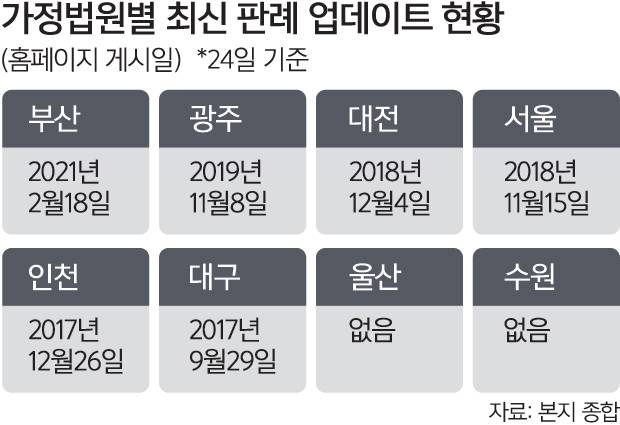 세계일보가 전국 8개 가정법원 홈페이지의 ‘우리 법원 주요 판결’을 분석한 결과 최신 판례를 제공하고 있는 곳은 부산가정법원 1곳으로 나타났다. 부산가정법원은 이달 18일 최신 판결문을 업데이트해 게시했다. 반면 광주가정법원은 2019년, 서울가정법원과 대전가정법원은 각각 2018년 판결문을 공개한 뒤로 손을 놓고 있다.