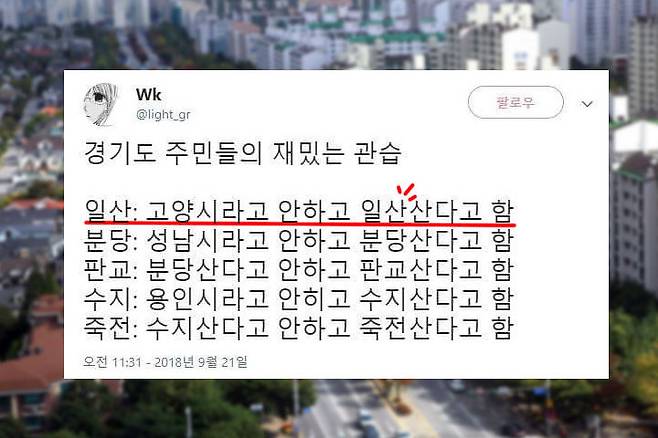 최근 sns에서 ‘경기도 주민들의 재밌는 관습’이라는 글이 많은 화제를 낳았다. “성남시 산다고 안하고 분당산다고 말한다”,“용인시 산다고 안하고 수지산다고 말한다”와 같은 내용이 사람들의 공감을 샀기 때문이다. 마찬가지로 “고양시에 산다고 말하지 않고 일산에 산다고 말한다”는 내용도 있었다.