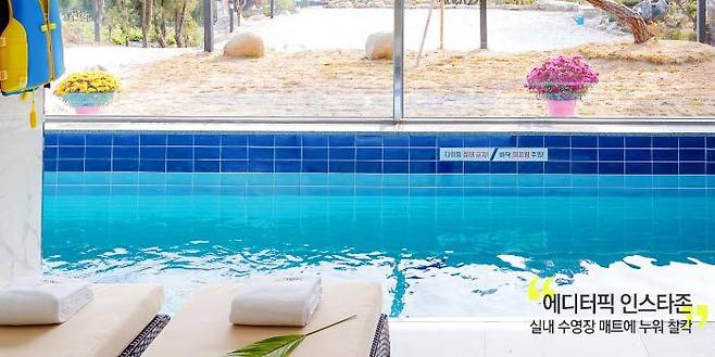 실내 수영장 베드에 살짝 몸을 뉘이고