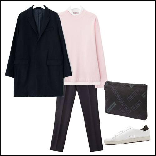 싱글코트, 핑크니트, 화이트셔츠: 에잇세컨즈
