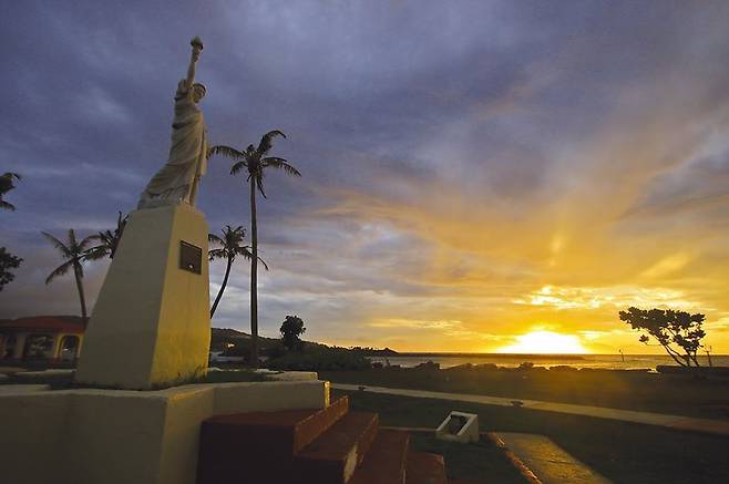 자유의 여신상과 함께 태평양의 노을을 만끽할 수 있는 '파세오 데 수사나 공원'은 차모로 빌리지와 함께 제2차 세계대전의 잔해물을 매립해 생긴 작은 반도 끝자락에 자리 잡고 있어요. 땅이 바다 쪽으로 돌출되어 180도가 넘는 파노라믹한 바다 풍경을 만끽하기에 더없이 좋은 곳.