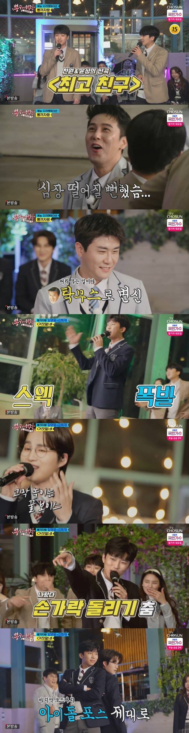 이찬원, 황윤성은 ‘최고 친구’를 불러 장민호, 영탁 팀과 대결을 펼쳤다. 장민호는 마이크에서 바람이 나오자 깜짝 놀랐고, 영탁은 바람 때문에 김무스 헤어스타일로 변신해 큰 웃음을 선사했다.