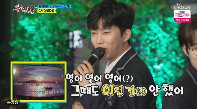 임영웅은 “학창 시절 국민 애창곡이었다”며 김희재와 빅뱅의 ‘거짓말’을 선곡했다. 도입부에 영어 랩이 나오자 임영웅은 “영어, 영어, 영어. 그때도 이런 건 안 했어”라고 능청스럽게 넘어갔고, 무대를 함께 하던 김희재도 웃음을 터트렸다.