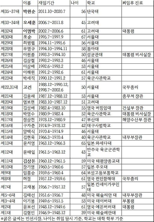 평균적인 서울시장은 어떤 모습일까. 나이 53살에 서울대(8명)를 나왔거나 외국 유학(11명)을 다녀온 남자다. 선출직만 보면 취임 당시 나이는 평균 57살이고, 서울시장을 지낸 뒤엔 대통령이 되거나 대선주자 후보 반열에 올랐다는 공통점이 있다.