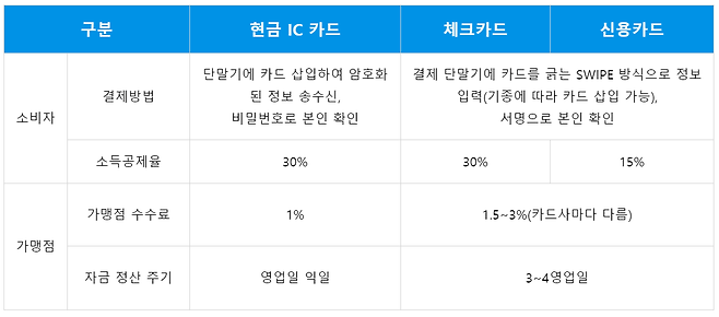 현금 IC 카드 결제를 하게 되면 사업장에서는 카드사에 지불해야 하는 카드 이용 수수료가 낮습니다. 또 대금의 일정 부분을 먼저 현금으로 지급받게 됩니다.