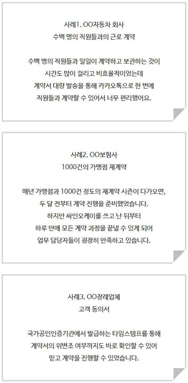 비대면 계약, 편리하다는 건 알겠는데, 아직은 다소 생소한 서비스이다 보니 실무에서 효율적으로 사용할 수 있을 지에는 의문이 따른다. 비대면 계약 서비스는 어떤 경우에 사용하면 좋을까? 비대면 계약 서비스 싸인오케이의 시스템은 다양한 계약서를 손쉽게 다운로드해 사용할 수 있도록 제작되어 있어 기업 간의 각종 업무 계약은 물론, 연봉 계약, 고용 계약 등의 근로 계약과 금융 거래 계약, 가맹 대리점 계약, 상품공급 계약 등 다양하고 넓은 범위에서 활용이 가능하다. 때문에 기업과 근로자들의 편의를 획기적으로 도모할 수 있다. 또한 언제 어디서나 사용할 수 있다는 장점을 바탕으로 외근이 잦은 직종에 종사하고 있거나, 재택근무 중인 직원들과의 계약도 무리 없이 이행할 수 있고, 프리랜서, 혹은 외주 직원 등을 고용할 때, 한 번에 많은 직원들과 계약을 진행해야 할 때에도 편리하고 신속하게 이용할 수 있다. 뿐만 아니라 싸인오케이의 비대면 계약 서비스는 국가공인인증기관에서 발급하는 타임스탬프를 통해 계약서의 위변조 여부까지 바로 확인할 수 있는 기능을 제공하고 있어 신속함과 동시에 안정성까지 확보했다는 강점이 있다. 아래의 사례들을 통해 비대면 계약 서비스의 이용 범위와 편리함을 더욱 쉽게 이해 가능하다.