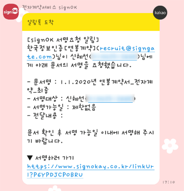 계약 프로세스는 생각보다 ‘더’ 간편하다. 우선 작성자가 서명할 계약서를 선택한 후 원하는 서명 방식을 고른다. 서명은 간편한 도장 이미지와 싸인으로도 가능하지만, 더 중대한 계약을 앞두고 있다면 서명에 사설인증서나 공인인증서를 심어 계약을 더욱 안전하게 체결할 수 있다. 싸인오케이에서 제공하고 있는 모든 서명방식은 전자서명법에 의거하여 법적인 효력을 지니고 있어 신뢰가 가능하기 때문에 때에 따라 원하는 서명 방식을 선택하면 된다. 이후 서명 대상자의 전화번호나 이메일을 기재한 뒤 계약서를 발송하게 되면 위의 사진과 같은 카카오톡, 혹은 이메일 등을 통해 상대방에게 서명 요청 알림이 전달된다.