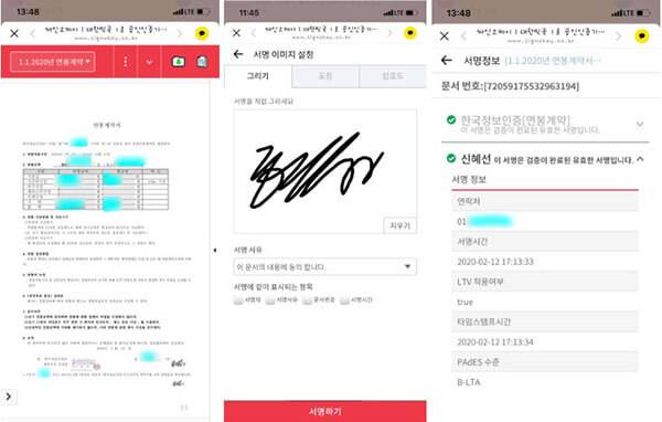 서명 요청을 받은 상대방은 도착한 계약서를 잘 확인한 후 서명을 진행하면 되는데, 이 때 별도의 도장 스캔 필요 없이 모바일에서도 바로 싸인이나 도장을 만들어 서명하는 것이 가능하다. 서명대상자가 서명을 완료하면, 계약 작성자가 계약을 최종적으로 승인할 수 있고, 최종 승인이 확인된 이후 작성자와 상대방 모두에게 계약서가 교부되면 일련의 계약과정이 모두 끝이 나게 된다.